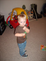 Here are some updated pictures of the kids. Devon loves sitting and holding Lizzy, and he also loves climbing into her little bumbo chair! In the second picture down he is putting on lip gloss! He gets into my makeup sometimes and ends up with pink lipstick streaked across his cheeks. So, I wanted to tell this story about Devon that was funny. A lot of times when we are driving in the car, I will ask him to look at Lizzy and tell me if she's asleep. He always tells me whether she is or not, and he never bothers her when he checks on her. Well, the other day, Bryce asked him if Elizabeth was sleeping and Devon pokes her and goes, "Lizzy, you sleepin?" Needless to say, she wasn't sleeping after that. It was pretty funny; you probably had to be there, but Devon cracks us up daily.